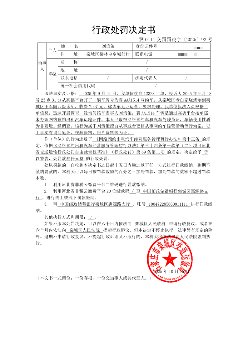 刘策策擅自从事或者变相从事网约车经营活动等行为案 冀0111交罚罚决字〔2025〕92号