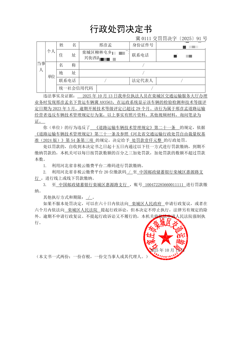 邢彦孟道路运输经营者违反车辆技术管理规定行为案 冀0111交罚罚决字〔2025〕91号