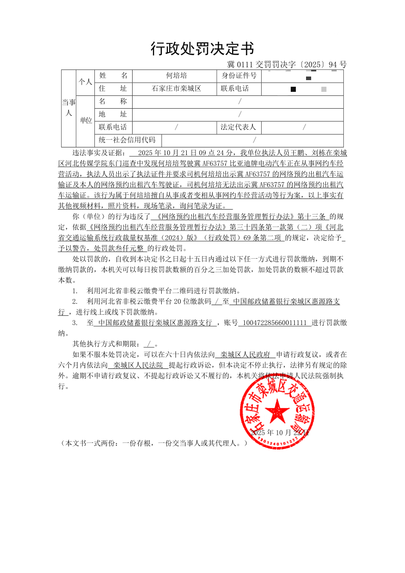 何培培擅自从事或者变相从事网约车经营活动等行为案 冀0111交罚罚决字〔2025〕94号
