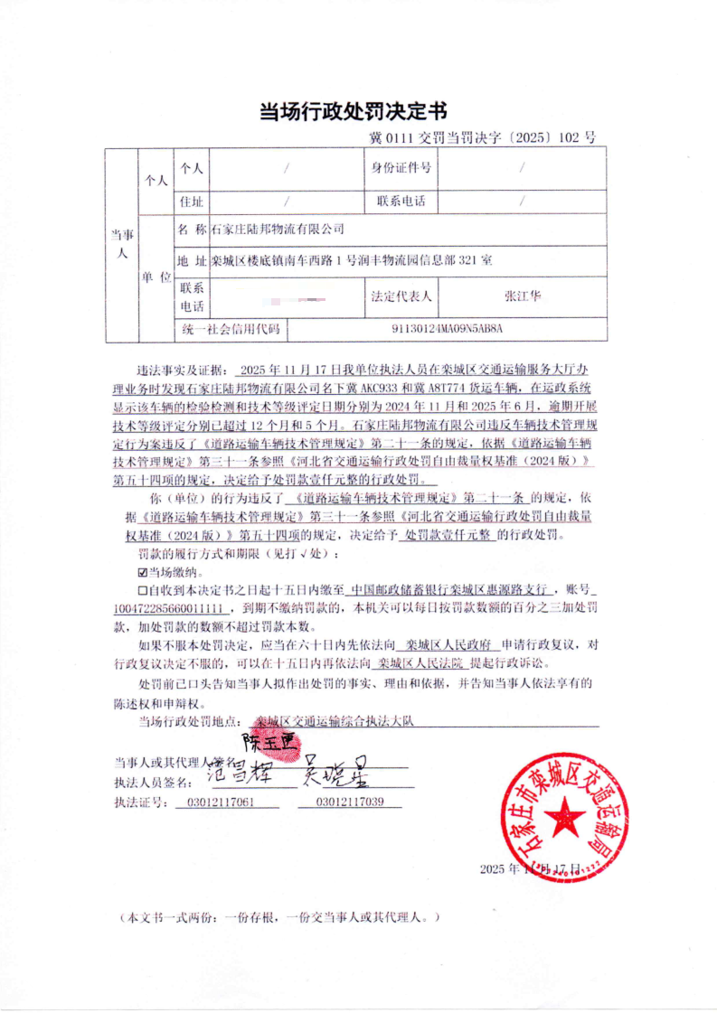 石家庄陆邦物流有限公司违反车辆技术管理规定行为案 冀0111交罚当罚决字〔2025〕102号