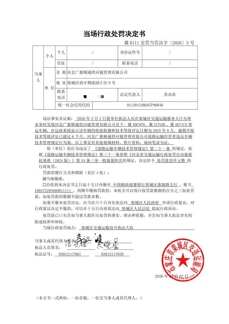 河北广惠顺通供应链管理有限公司道路运输经营者违反车辆技术管理规定行为案 冀0111交罚当罚决字〔2026〕5号
