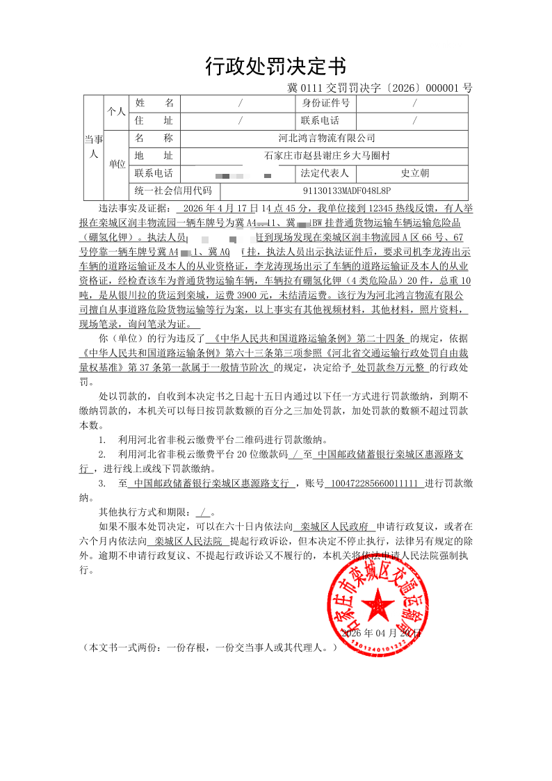 河北鸿言物流有限公司擅自从事道路危险货物运输等行为案